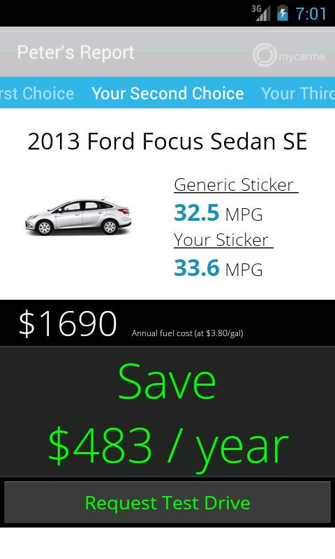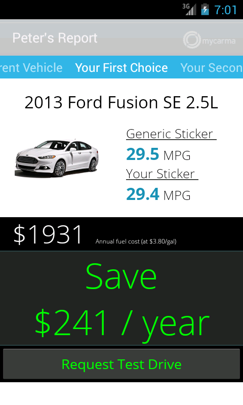 The app connects to a driver's current Ford vehicle using OpenXC-compatible hardware, and after collecting data for a week, MyCarma OpenXC informs the driver of their personal fuel economy and how much they could save on fuel with their next vehicle purchase.